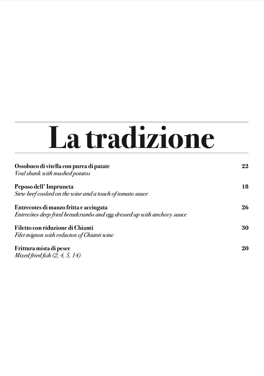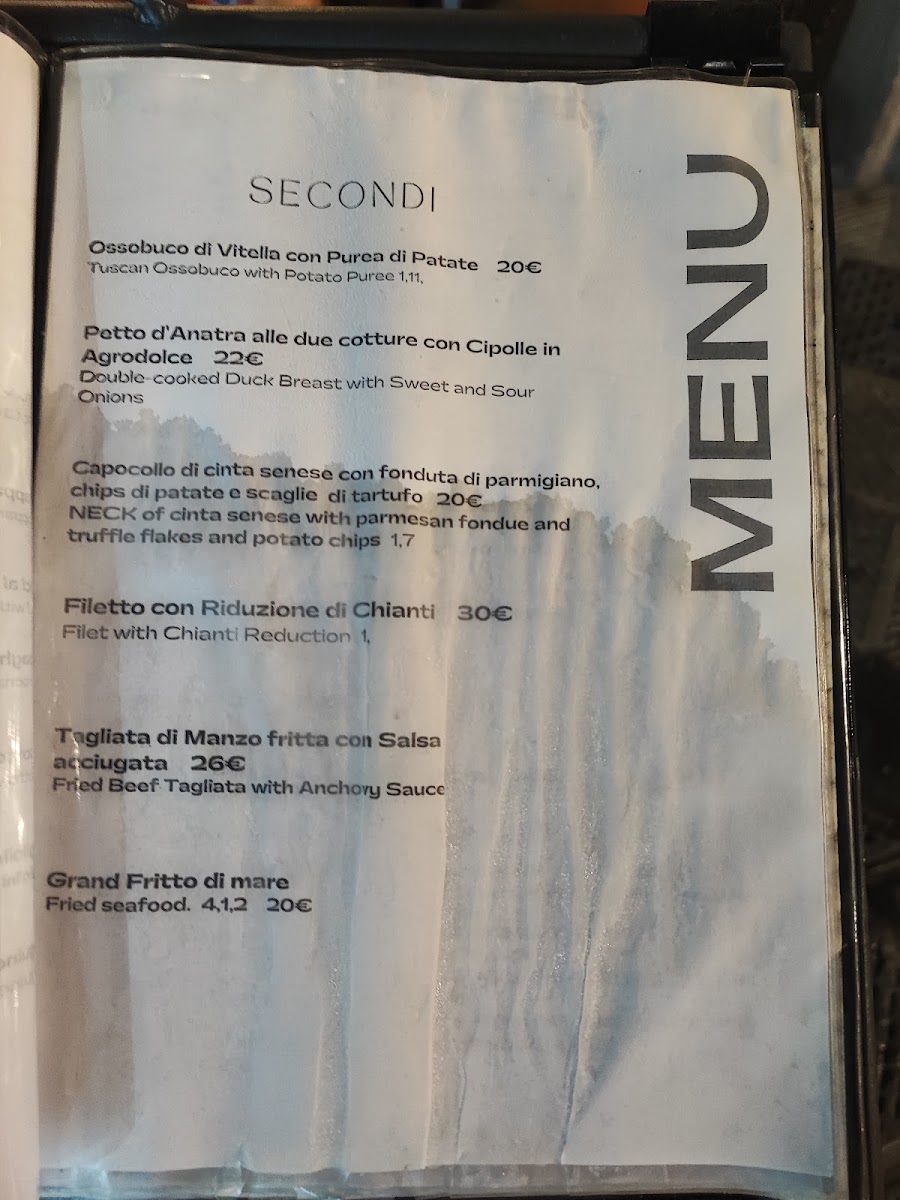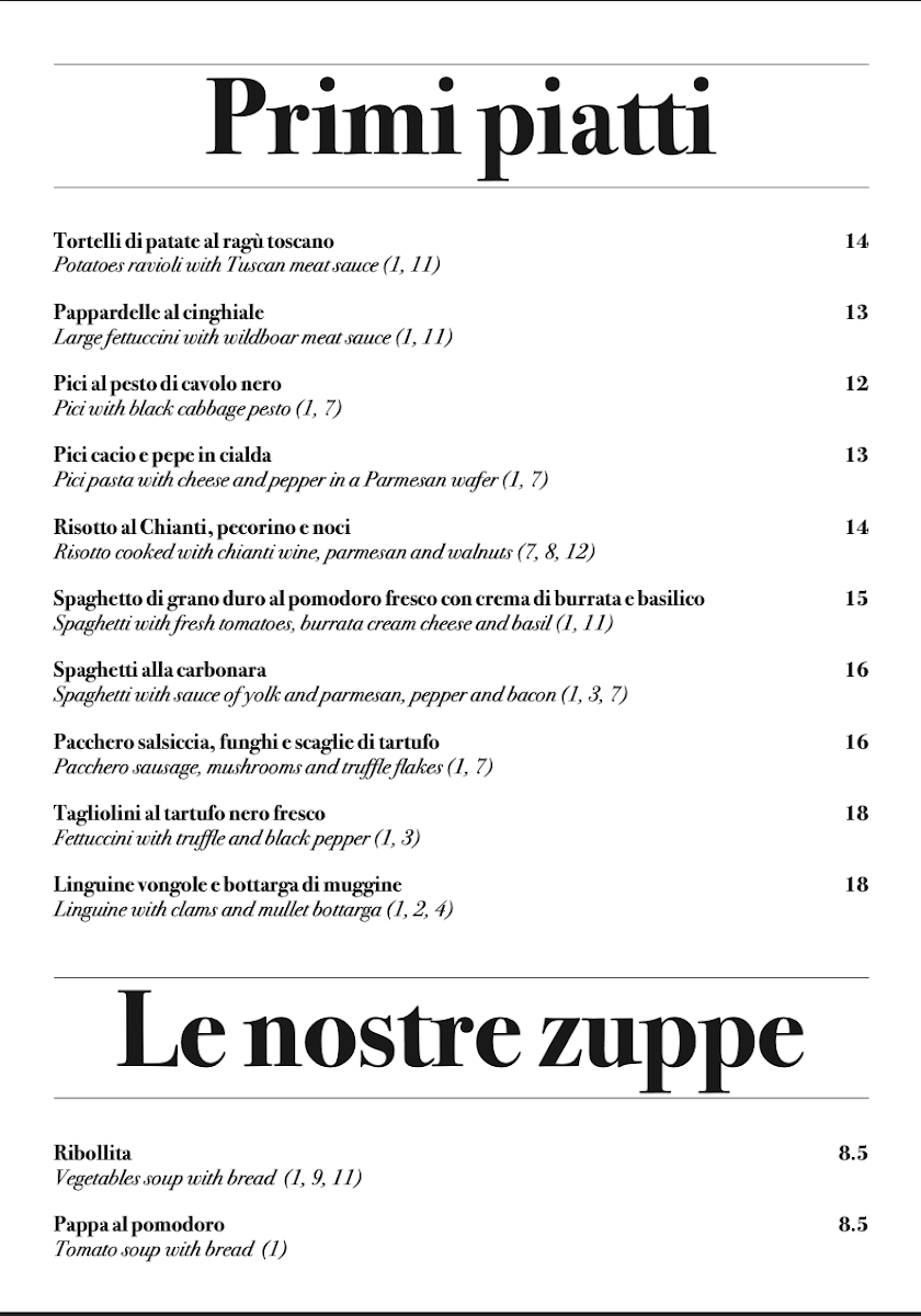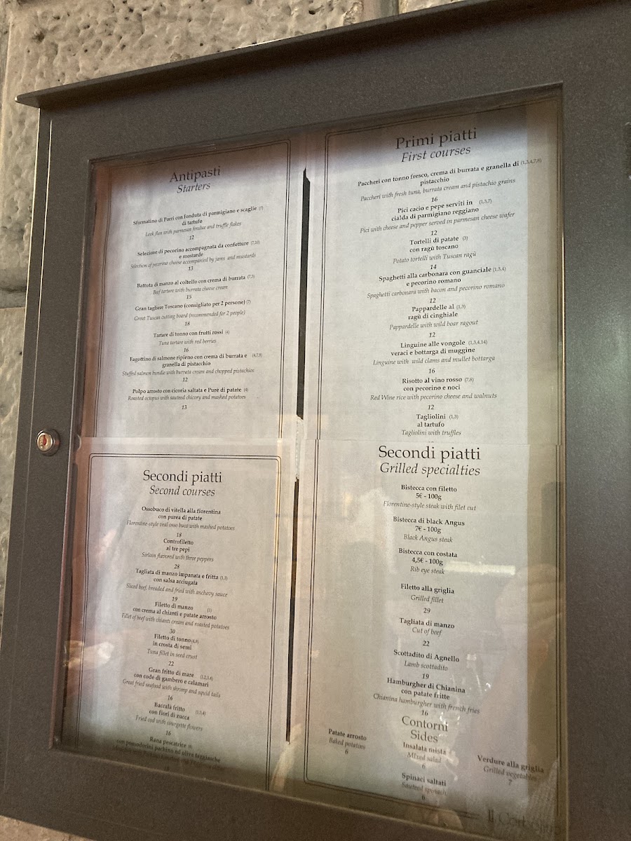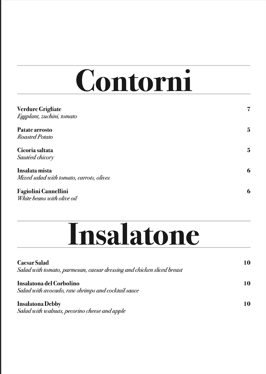 Osteria Il Corbolino’s menu offers a compelling journey through traditional Tuscan flavors with a modern twist. The ANTIPASTI stand out with options like Gran Tagliere Toscano (recommended for 2), battuta di manzo al coltello with burrata and Dijon mustard, sformatino di porri with 30-month-aged Parmigiano and black truffle shavings, and polpo arrosto with sautéed chicory and potato purée, alongside lighter indulgences such as Brie Fritto. Among the PRIMI PIATTI, highlights include the creamy Pici cacio e pepe served in a Parmigiano crisp, Risotto al vino rosso with pecorino and walnuts, Linguine vongole e bottarga di muggine, Tortelli di patate al ragù toscano, and the rich Pappardelle al ragù di cinghiale. For the SECONDI PIATTI, seafood lovers can enjoy the Gran fritto di mare, while meat dishes such as Capocollo di Cinta Senese with Parmigiano fondue, potato chips, and truffle shavings, Tagliata di manzo fritta with anchovy sauce, Filetto di manzo al Chianti with roasted potatoes, and the iconic Bistecca alla Fiorentina demonstrate the kitchen’s dedication to quality and flavor. Complementing these are CONTORNI like verdure alla griglia, insalata mista in cialda di Parmigiano, patate arrosto, and spinaci saltati, perfect for balancing the heartier mains. The SECONDI PIATTI ALLA GRIGLIA section further emphasizes the restaurant’s mastery of grilled meats, featuring Bistecca con filetto, Bistecca di Black Angus, Bistecca alla Fiorentina Chianina, Filetto alla griglia, and Tagliata di manzo, each promising a satisfying, robust taste of Tuscany. Overall, Osteria Il Corbolino presents a menu that carefully blends traditional recipes with refined touches, offering both variety and depth that appeal to seasoned diners and first-time visitors alike.