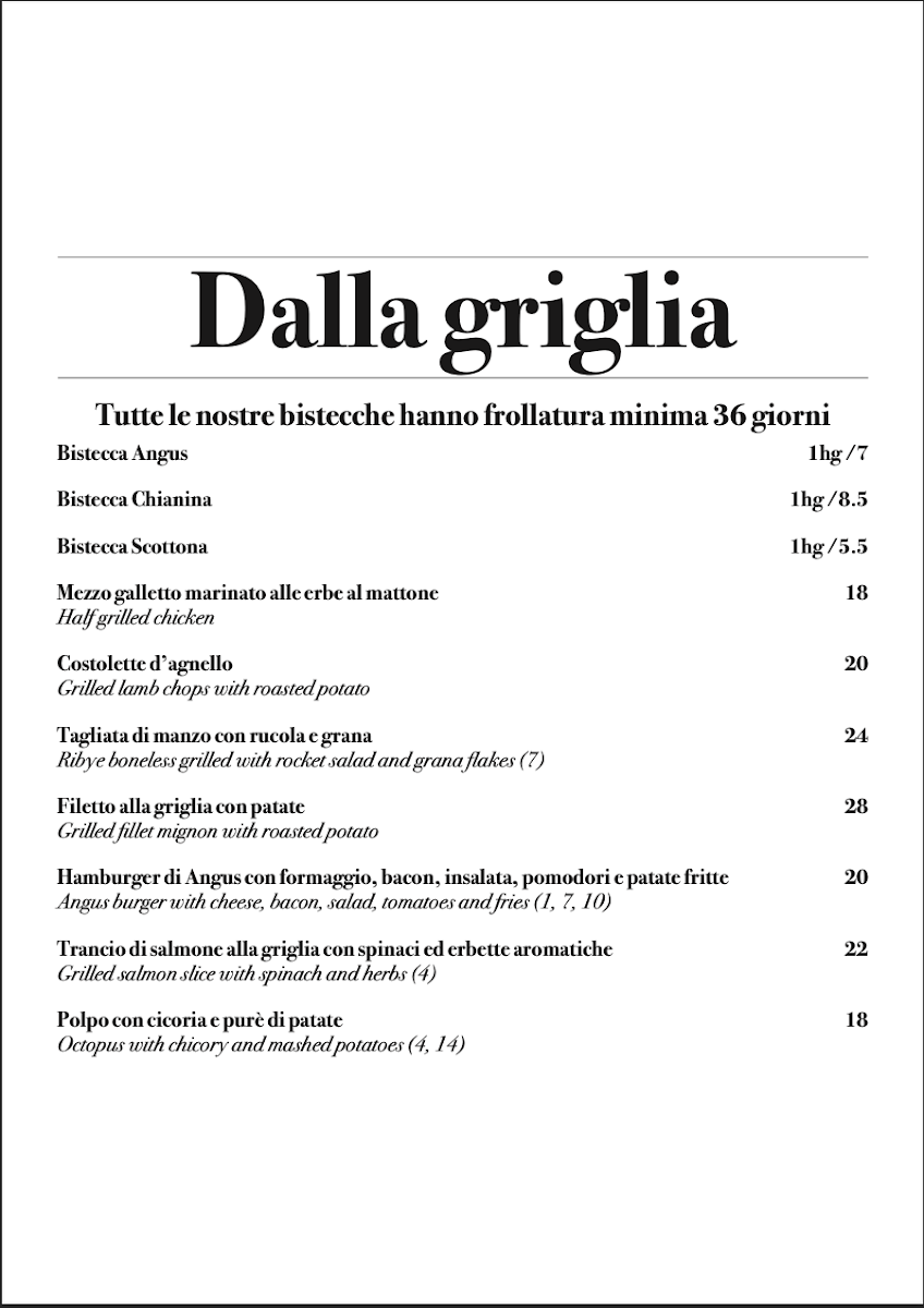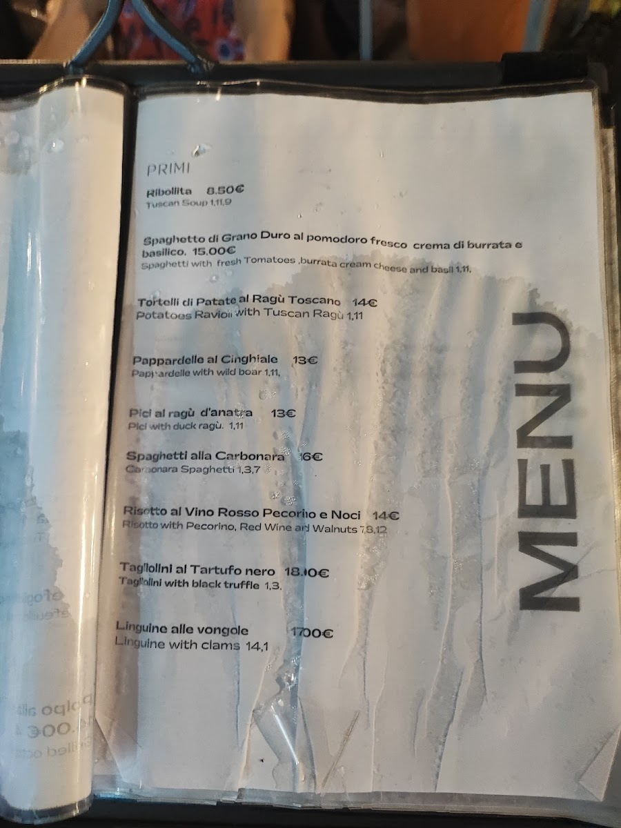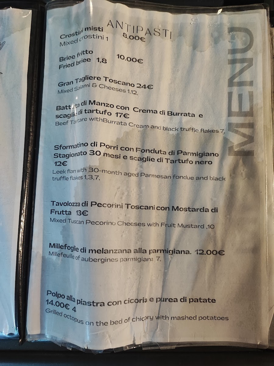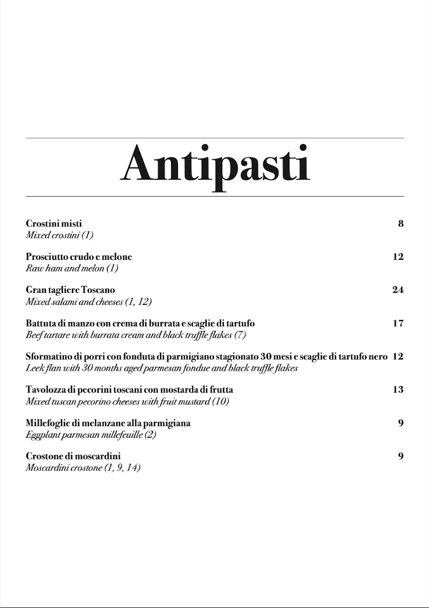 Osteria Il Corbolino’s menu offers a compelling journey through traditional Tuscan flavors with a modern twist. The ANTIPASTI stand out with options like Gran Tagliere Toscano (recommended for 2), battuta di manzo al coltello with burrata and Dijon mustard, sformatino di porri with 30-month-aged Parmigiano and black truffle shavings, and polpo arrosto with sautéed chicory and potato purée, alongside lighter indulgences such as Brie Fritto. Among the PRIMI PIATTI, highlights include the creamy Pici cacio e pepe served in a Parmigiano crisp, Risotto al vino rosso with pecorino and walnuts, Linguine vongole e bottarga di muggine, Tortelli di patate al ragù toscano, and the rich Pappardelle al ragù di cinghiale. For the SECONDI PIATTI, seafood lovers can enjoy the Gran fritto di mare, while meat dishes such as Capocollo di Cinta Senese with Parmigiano fondue, potato chips, and truffle shavings, Tagliata di manzo fritta with anchovy sauce, Filetto di manzo al Chianti with roasted potatoes, and the iconic Bistecca alla Fiorentina demonstrate the kitchen’s dedication to quality and flavor. Complementing these are CONTORNI like verdure alla griglia, insalata mista in cialda di Parmigiano, patate arrosto, and spinaci saltati, perfect for balancing the heartier mains. The SECONDI PIATTI ALLA GRIGLIA section further emphasizes the restaurant’s mastery of grilled meats, featuring Bistecca con filetto, Bistecca di Black Angus, Bistecca alla Fiorentina Chianina, Filetto alla griglia, and Tagliata di manzo, each promising a satisfying, robust taste of Tuscany. Overall, Osteria Il Corbolino presents a menu that carefully blends traditional recipes with refined touches, offering both variety and depth that appeal to seasoned diners and first-time visitors alike.